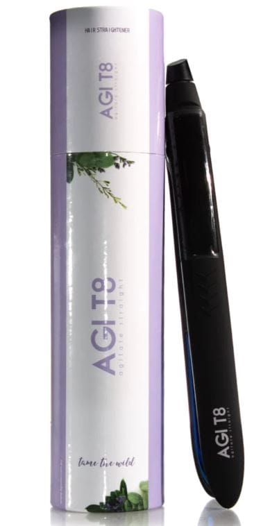 The latest technology in straightening irons. AGI T8. It is a floating titanium plate that is ergonomically curved to act as a virtual extension of your hand. The sleek surf board like tip allows you to get close to those awkward areas like ears etc. It is a soft touch iron that will vibrate when closed which will work to push the positive and negative ions deep into the hair shaft. The exciting new packaging design not only looks great but allows you to continue to use it rather than those bulky rectangular boxes. Comes with a free heat pouch.