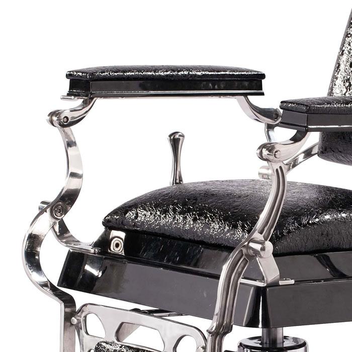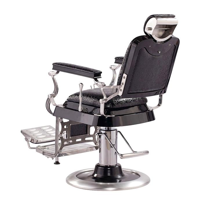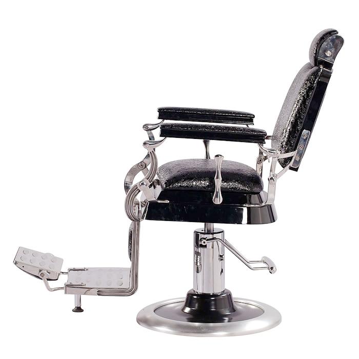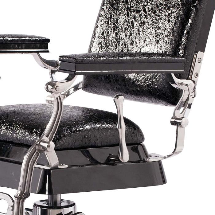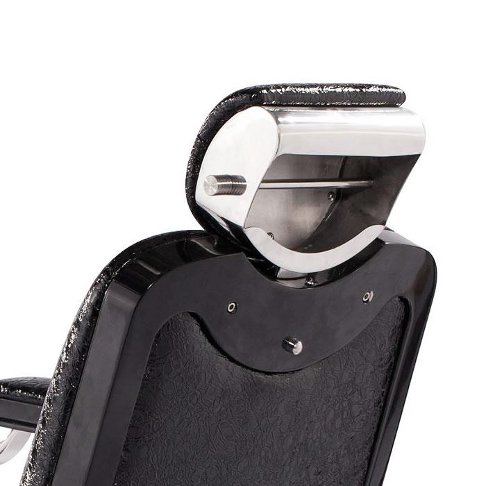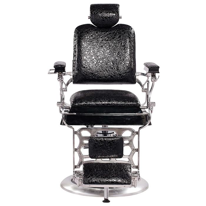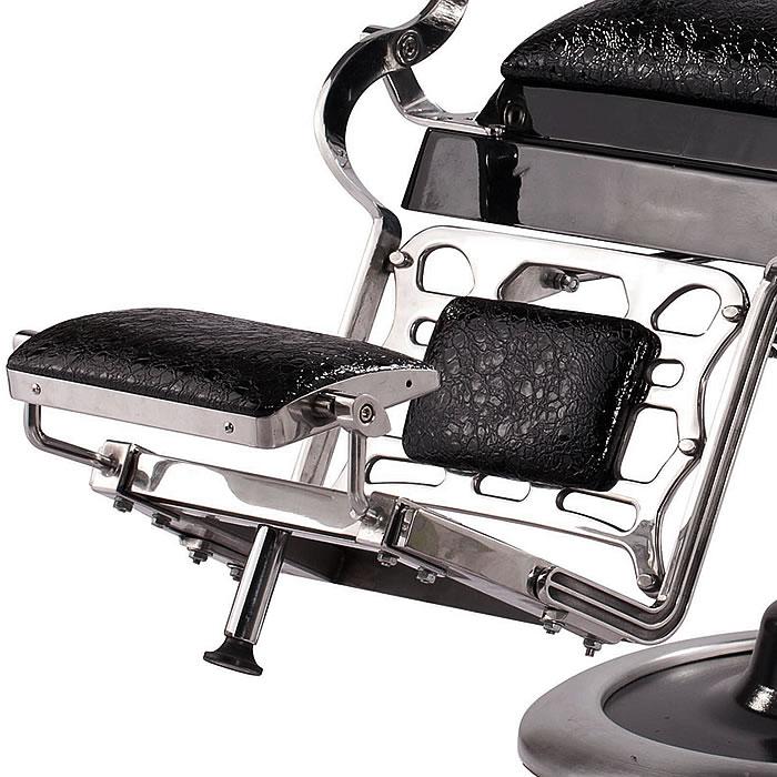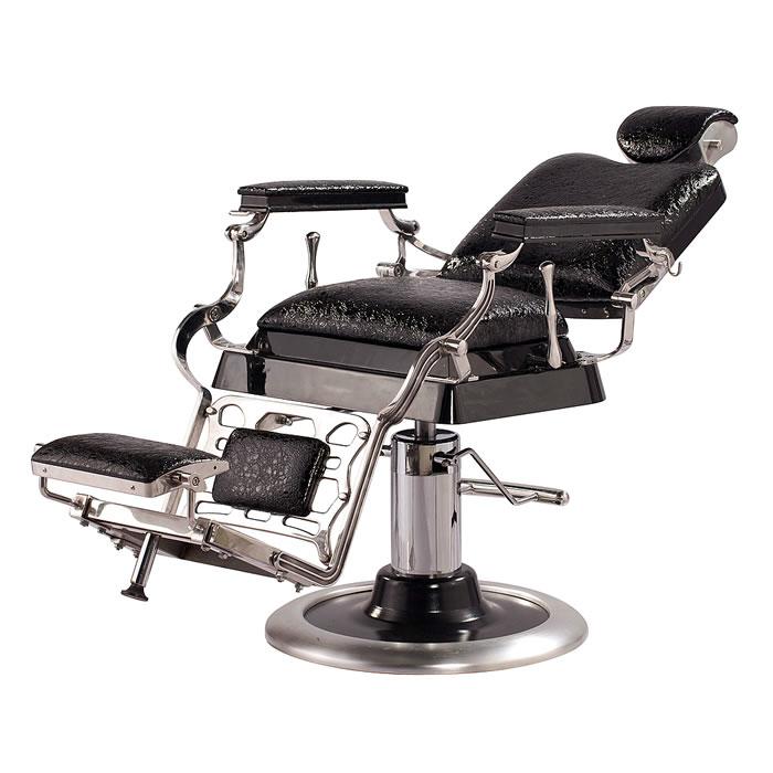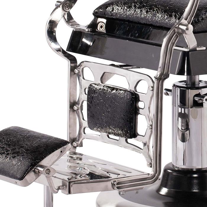 Inspired by the original design dating back to 1922, this antique style barber chair with high grade crocodile vinyl has everything a barber needs at their disposal. This chair features a reclinable back so customers can feel comfortable while being easily positioned. It also has an adjustable headrest, removable bar for neck strips, towel rack, clipper hook, padded calf panel, and heavy duty hydraulic pump. Classic antique look, upgraded with exotic upholstery and hand polished stainless steel edges.