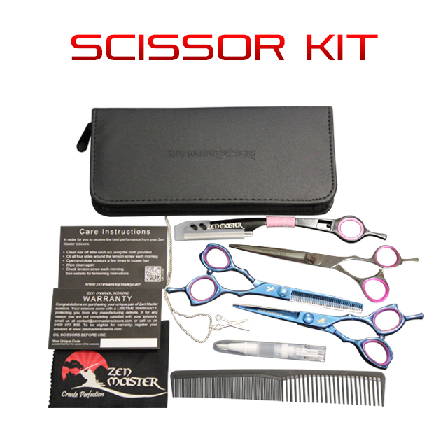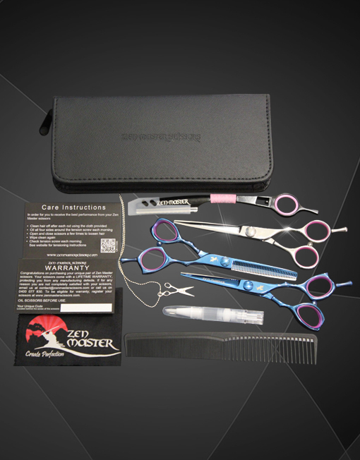 The perfect Apprentice / Student Scissor Kit has been created by Zen Master Scissors. Accepted in all colleges/cosmetology schools around the world, this kit provides you with everything you’ll need to get you started with cutting in the wonderful world of hairdressing. Learn to cut like a professional with our ergonomically and anatomically designed 5.5″ scissors and 6″ texturizer. Perfect for stabilizing your hand to alleviate the fumbling stage out of learning cutting. Perfectly suited for learning to cut on mannequin heads. Also included is a 6.25″ scissor for learning men’s cutting and solid form. Bonus items include a carbon comb, razor, scissor necklace, oil bottle and cleaning cloth all in a beautiful luxury case. Great value for a great beginning.